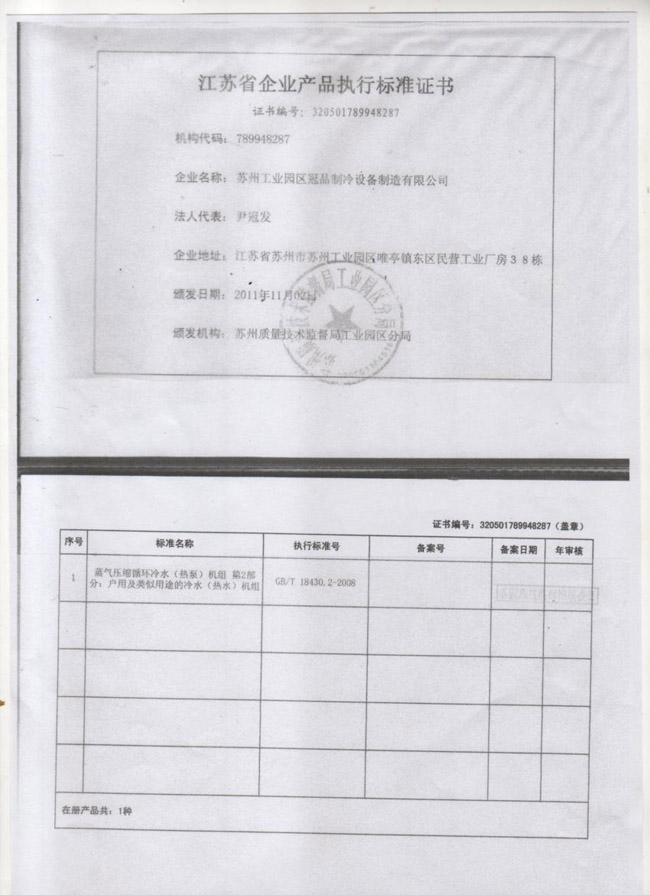 江蘇省企業(yè)產(chǎn)品執(zhí)行標(biāo)準(zhǔn)證書